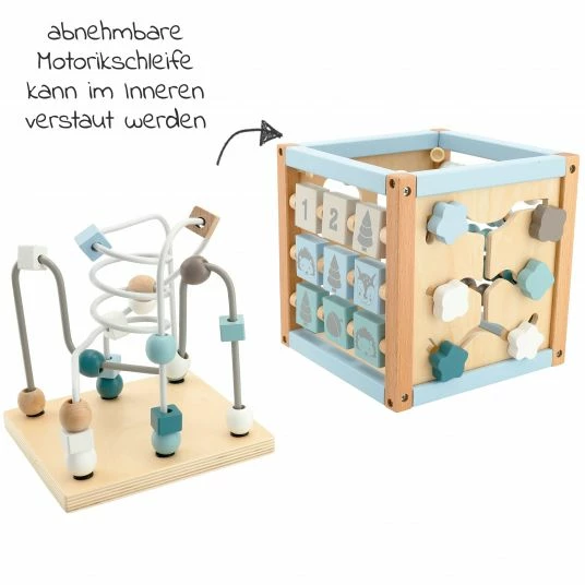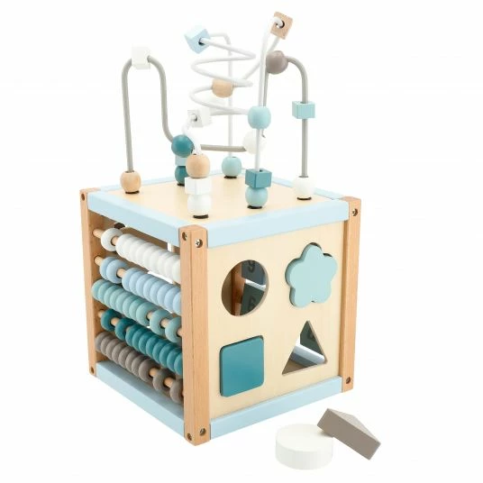 Der süße Holzwürfel im Scandi-Design in ansprechenden Farben ist mit vielen Spielmöglichkeiten ausgestattet. Jede Würfelseite ist mit einem Spiel versehen und fördert unterschiedliche Fähigkeiten: Das Labyrinth mit niedlichen Blumen-Schiebern und die Motorikschleife regen die Feinmotorik des kleinen Entdeckers an. Gleichzeitig helfen die beiden Spiele dabei, Problemlösungen zu entwickeln.
