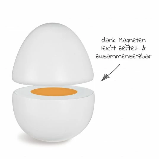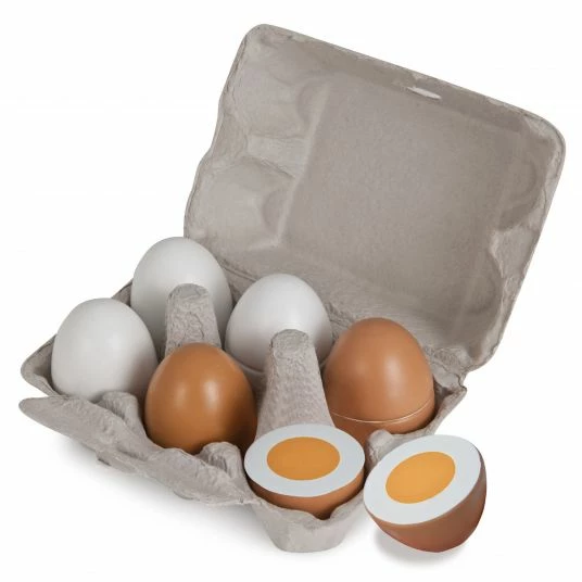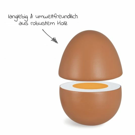 Vom Frühstücksei über belegte Brötchen bis hin zur Backzutat für einen selbstgebackenen Kuchen – mit den 6 enthaltenen Eiern kann sich Dein kleiner Koch nach Herzenslust austoben. Sehr praktisch: Die Holzeier sind mit Hilfe eines Magneten leicht zerteil- und wieder zusammensetzbar und können beliebig oft in die Schachtel zurückgelegt werden. Durch die Interaktion mit Freunden und der Familie werden die Geschicklichkeit, Feinmotorik und Kreativität geschult.