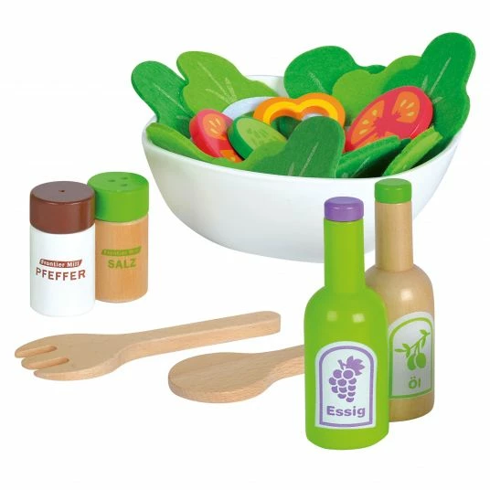 Die weiße Kunststoffschüssel bietet genug Platz, um den Salat mit Salatblättern und Zwiebelringen aus Filz sowie Gurkenscheiben, Paprikaringen und Tomaten aus Holz darin anzurichten. Salz und Pfeffer sowie Essig und Öl aus Holz stehen ebenfalls bereit. Das Salatbesteck liegt gut in den kleinen Händen und vermischt alles in Sekundenschnelle. Aus hochwertigen Materialien gefertigt kann alles unbedenklich benutzt werden und bleibt für viele Jahre ein Highlight im Kinderzimmer.