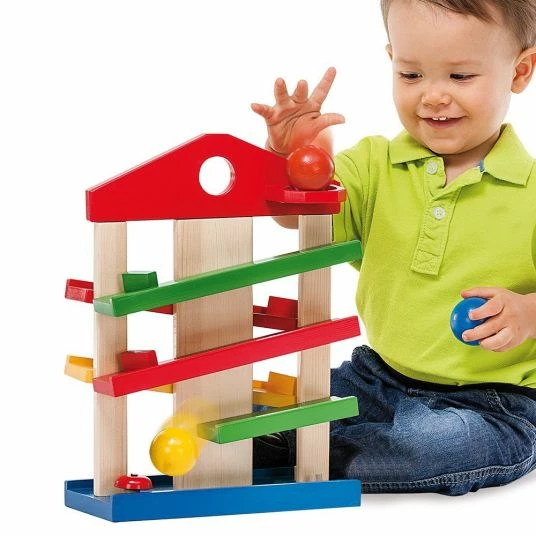 The Kugelbahn-Haus by Eichhorn is a toy that promotes motor skills and should not be missing in any nursery. The little ones find it simply great to have set something in motion themselves and are fascinated by the course of the rolling objects. On the way down, the balls pass five track sections and at the end a bell waits for their use.