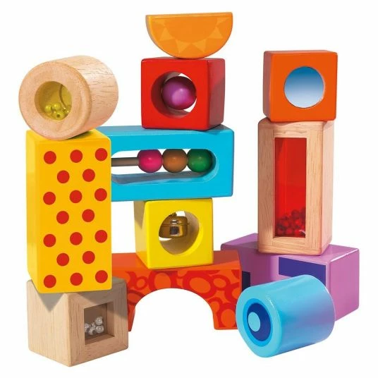 The wood sound components 12-piece from Eichhorn really have it in them: they are colorful, differently shaped and filled with bells; balls, pearls and much more. So your offspring will not only have fun rattling and can create their own buildings, but your child will also be promoted playfully: Acoustics, motor function and hand-eye-coordination are traniert.