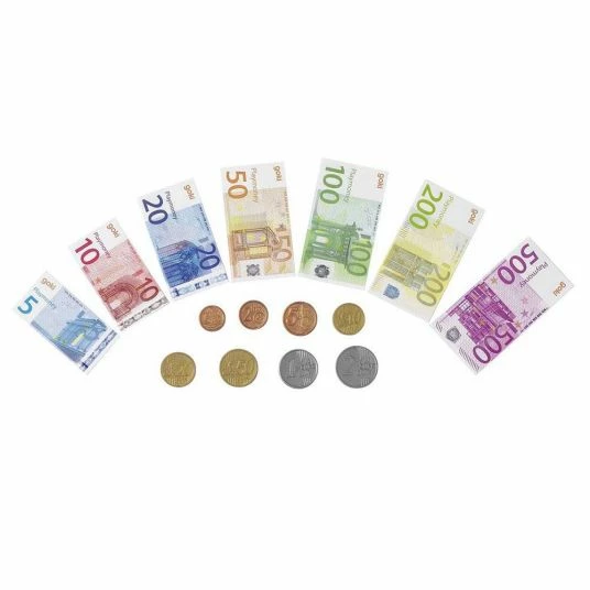 Wer einkauft, muss auch bezahlen können. Für einen gesicherten Großeinkauf im Kaufmannsladen sorgen 84 Banknoten und 32 Münzen aus. Mit den Papierscheinen und Plastikmünzen lassen sich Alltagssituationen fantasievoll Nachspielen. Gleichzeitig lernt Ihr kleiner Liebling Regeln und grundlegende Prozesse kennen.