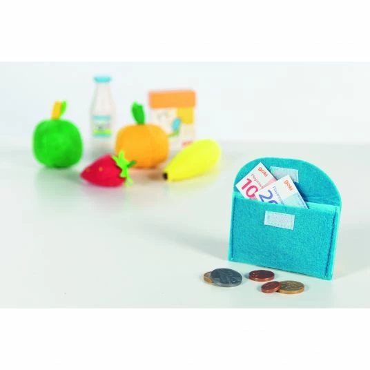 Das 9tlg. Set Einkaufstasche mit Zubehör von Goki ist bereits mit Obst, Gemüse, Milch, Butter & Mehl gefüllt. Außerdem ist eine kleine Geldbörse mit Klettverschluss für Spielgeld dabei. Die Filztasche mit dem Zubehör rundet jedes Kaufladensortiment perfekt ab. In der praktischen Tasche lassen sich die Einkäufe super transportieren.