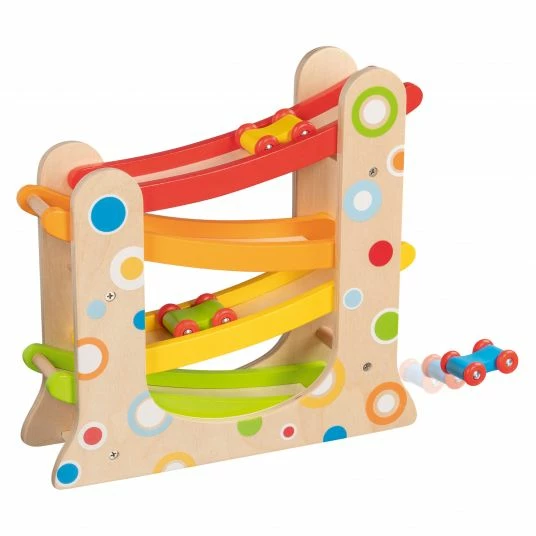 Mit der Goki Autorennbahn erlebt Dein Kleines Förderung und Spielspaß in Einem: Es kann die 3 Autos in unterschiedlichen Farben selbst zum Fahren bringen und so rasante Rennen beobachten. Damit die Autos auch alle richtig auf der Fahrbahn landen, ist etwas Fingerspitzengefühl notwendig. So kann der kleine Entdecker seine Feinmotorik trainieren und konzentriert beobachten, wie die Autos im Zick-Zack über die Rennbahn flitzen.