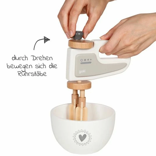 Für noch mehr Spaß in der Kinderküche! Mit dem Goki Küchengerät Handmixer mit Rührschüssel kann sich Dein kleiner Schatz spielerisch als kleiner Bäcker üben. Die Interaktion mit Freunden und der Familie schulen die Geschicklichkeit und Kreativität. Dank des Hebels kann das Kind mit seinen Händchen die Mixerstäbe mit etwas Übung in Bewegung setzen und trainiert so seine Feinmotorik. Das Set beinhaltet einen Handmixer aus Holz und eine passende Schüssel, mit der allerhand Lieblingskuchen entstehen können.
