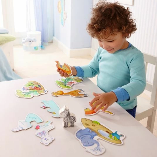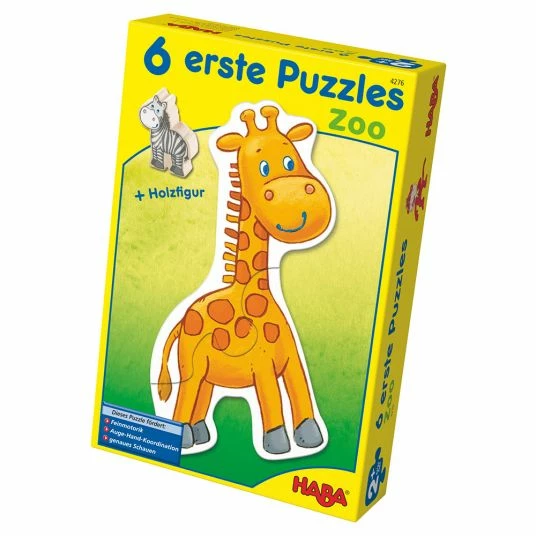 6 erste Puzzles Zoo mit Spielfigur von Haba lässt die Herzen kleiner Puzzlefans höher schlagen. Die Tier-Puzzles bestehen aus 2 bis maximal 4 stabilen Teilen aus Pappe, die von kleinen Händen gut gegriffen werden können. Beim Zusammenpuzzeln werden die Hand-Augen-Koordination und Konzentration spielerisch geschult. Die liebevoll gestaltete Holzfigur in Form eines Zebras fördert die Fantasie und lädt zusätzlich zum Spielen ein.