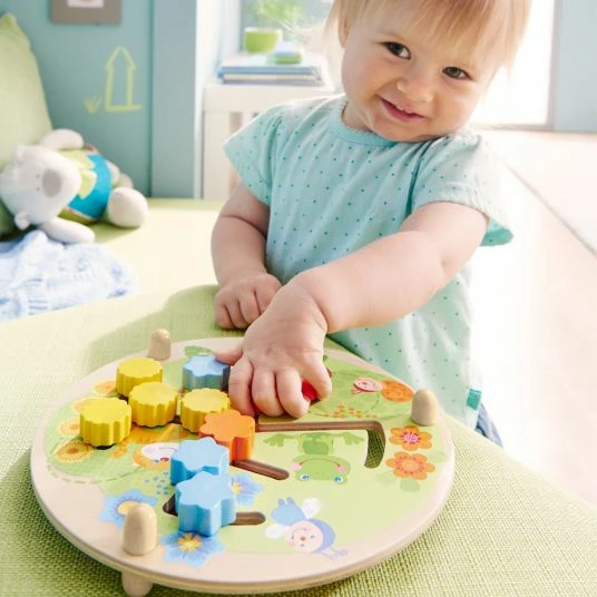 Das Motorikbrett Blumen von Haba fördert spielerisch das Verständnis von Farben und Zahlen. Hier werden 10 kleine Knöpfe durch das Labyrinth geführt, um die bunten Holzknöpfe farblich dem Blumen-Motiv zuzuordnen. Auf der Rückseite gibt es die Zahlen 1 – 4 zu entdecken. Auch hier kann Dein kleiner Schatz die Knöpfe farblich den Zahlen zuordnen.