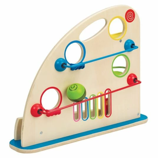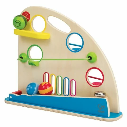 With the ball racetrack from Hape your child gets a first impression of speed and will not get enough of it to let the colorful wooden balls race. The colourful track lets the large wooden balls race down through tunnel holes and over iron rails. Watching the balls speed down the track from left to right, sometimes slower, sometimes faster, no boredom comes up. The colours used are water-based and therefore completely harmless for your child.