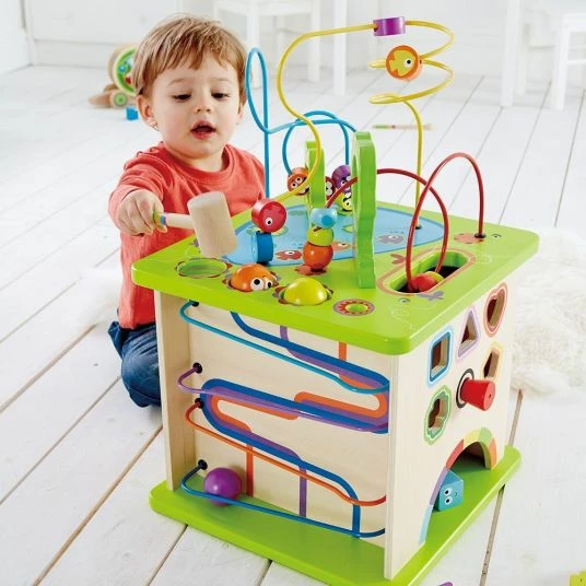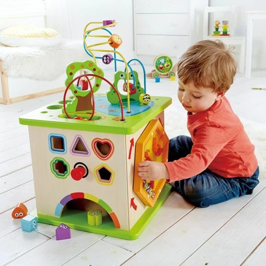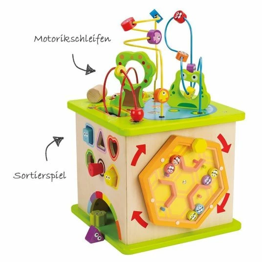 With the Motor cube Small animals from Hape there is no guaranteed boredom in the nursery. The colourful wooden cube can be played from five sides and offers a variety of tasks. Different motoric loops and a hammer game are located on the upper side, while the four sides are equipped with a sorting game, a ball track, a turntable and a labyrinth. With the friendly animals and figures there is enough to discover, understand, turn and play. The different stations playfully promote the hand-eye coordination, motor skills, concentration and dexterity of your child. The motoric cube is made of solid wood and will be fun for your child for a long time.