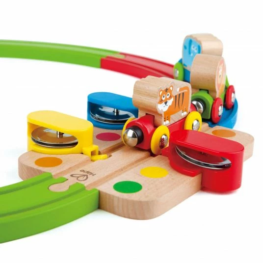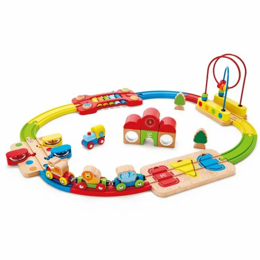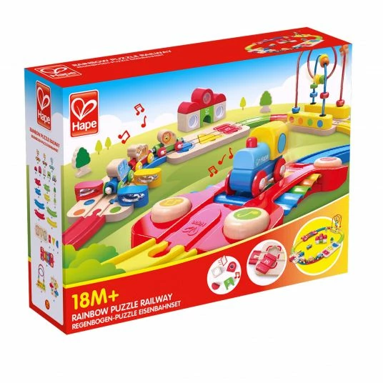 Mit dem Regenbogen-Puzzle Eisenbahnset von Hape erweitern die Kinder spielerisch ihr Wissen. Mit diesem bunten Schienen-Satz wird Spielzeit zur Lernzeit. Löse mit Deinem Kind das Perlenlabyrinth und das Puzzle, während Ihr mit dem Tierzug über die Schienen fahrt. Mit der Xylophon- und der Tamburin-Schiene kannst Dein Kind zusätzlich noch Musik erzeugen.