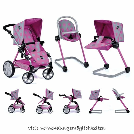 Der leichte Wagen eignet sich perfekt fΓΌr AusflΓΌge mit der Lieblingspuppe. Im weichen Sportwagenaufsatz kΓΆnnen Puppen liegen oder sitzen. Dazu lΓ€sst sich die RΓΌckenlehne mehrfach verstellen. Der ganze Sitz kann einfach umgesetzt werden. So kann das PΓΌppchen zum Kind oder nach vorne gucken. Ein groΓes Verdeck schΓΌtzt vor Sonne und Wind. 3-Punkt-Gurt und SchutzbΓΌgel sorgen fΓΌr die nΓΆtige Sicherheit. Der Wagen passt sich prima auf die GrΓΆΓe Deines Kindes an. Dazu kann der Schieber in der HΓΆhe groΓzΓΌgig verstellt werden (40-66 cm). So wΓ€chst der Puppenwagen praktisch mit.