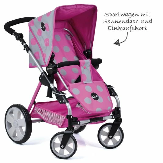 - Kombi-Puppenkinderwagen mit umsetzbarem Sportsitz. Ausgestattet mit Sonnenverdeck, Gurtsystem und hΓΆhenverstellbarem Schieber.