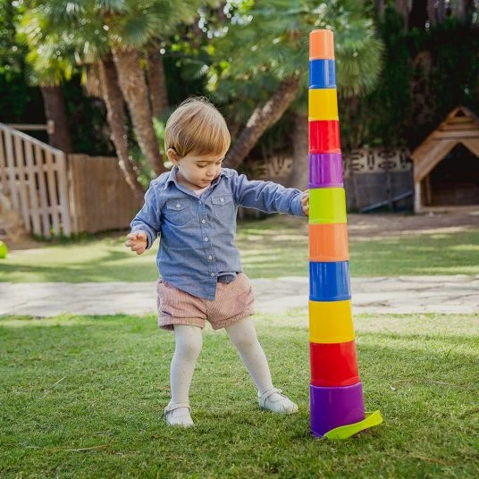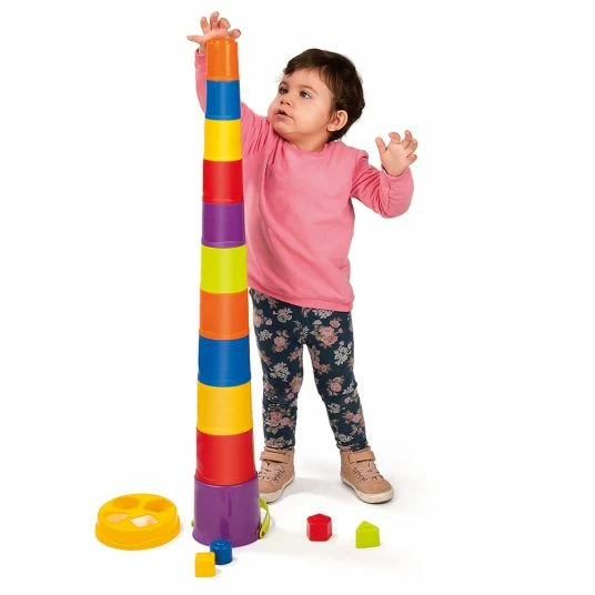 Der Stapelturm Gianttemit Steckspiel von Miniland hรคlt gleich zwei tolle Spiele fรผr Dein Kind bereit. Die 10 bunten Becher lassen sich mit dem Henkeleimer zu einem 95 cm hohen Turm stapeln. Der groรe Eimer lรคsst sich aber mit dem enthaltenen Aufsatz auch zu einem tollen Steckspiel umfunktionieren. Dazu beinhaltet das Spielzeug noch 4 unterschiedliche Fรถrmchen, die richtig zugeordnet werden mรผssen. Doch die Fรถrmchen halten noch eine weitere รberraschung parat: dank kleiner Lรถcher im Boden, kรถnnen sie auch prima als Sand- und Wasserspielzeug verwendet werden. Durch die Lรถchlein rieselt fein der Sand und tropft Wasser wie Regen heraus. Alle Becher und Fรถrmchen kรถnnen im Inneren des groรen Eimers mit Henkel platzsparend verstaut und transportiert werden. Somit ist Giantte auch ideal fรผr den Spielplatz und Strand geeignet.