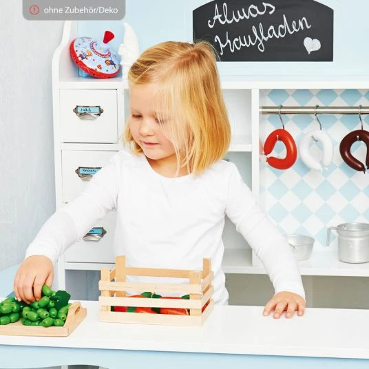 The side counter can be attached to the left or right as desired. Under the sales counter there are two displays in which the goods for sale can be presented in the best possible way. On the rear wall there are 6 push handles equipped with retro metal shell handles. The labels supplied and individually labelled beforehand can be inserted into the labeling frames to reveal the contents. On a bar with 3 hooks and on various shelves there is enough space for all kinds of food and products. On the writable board you can tell your customers what is on offer today, whether it is a butcher’s shop, a Bรคcker or a toy shop, or simply paint on it to your heart’s content with chalk.