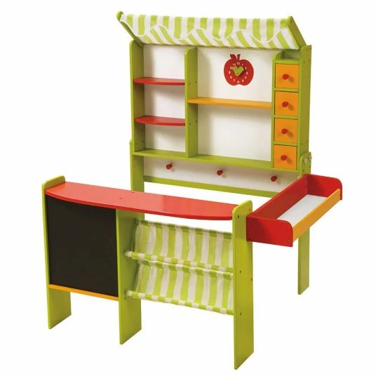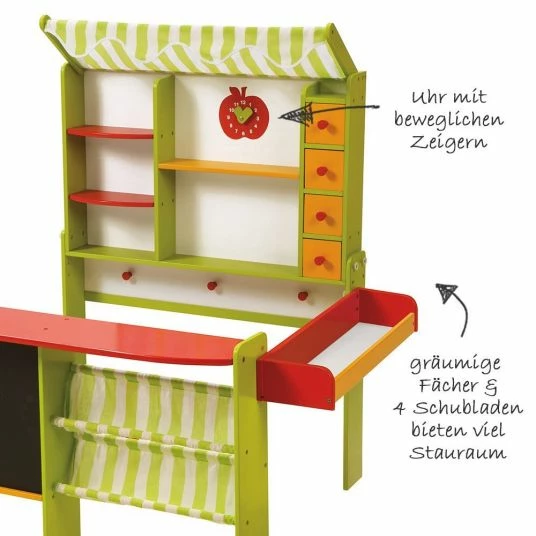 In den 4 Holzschubladen, geräumigen Fächern und Stoffablagen können außerdem alle möglichen Waren und kleine Schätze untergebracht werden. 3 Haken sorgen für züsätzliche Präsentationsmöglichkeiten. Die grün weiß gestreifte Markise schützt die empfindliche Ware vor der Sonne. Eine Uhr mit beweglichen Zeigern ermöglicht noch mehr realitätsnahen Spielspaß. Mit dem Verkaufsstand von Roba hat die Langeweile – vor allem an verregneten Nachmittagen – keine Chance mehr!